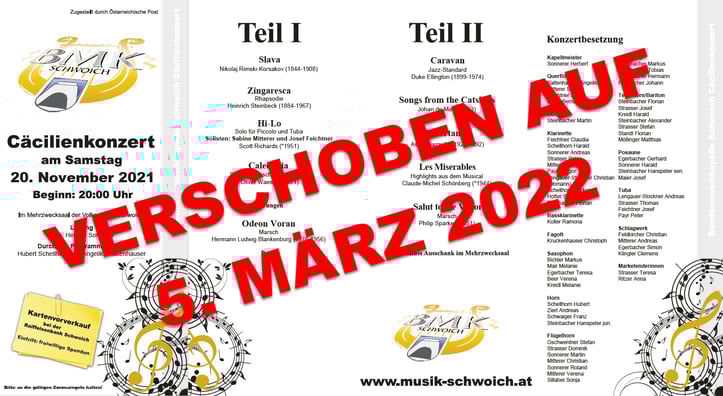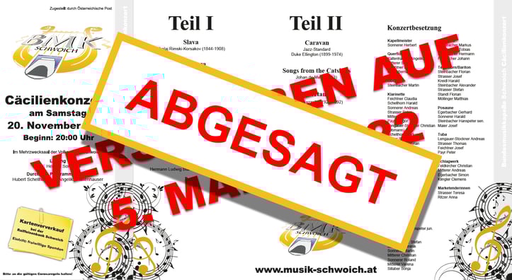 Leider müssen wir aufgrund der kurzfristig veränderten Rahmenbedingungen (2G) bzw. der Gesamtinfektionslage unser Cäcilienkonzert auf den 𝟱. 𝗠ä𝗿𝘇 𝟮𝟬𝟮𝟮 verschieben.